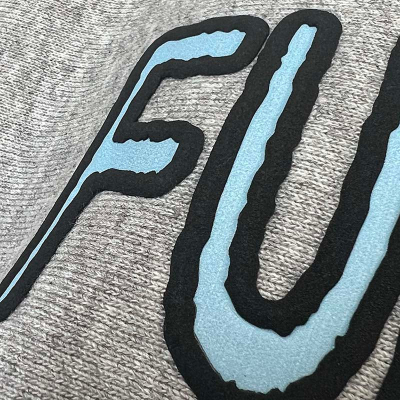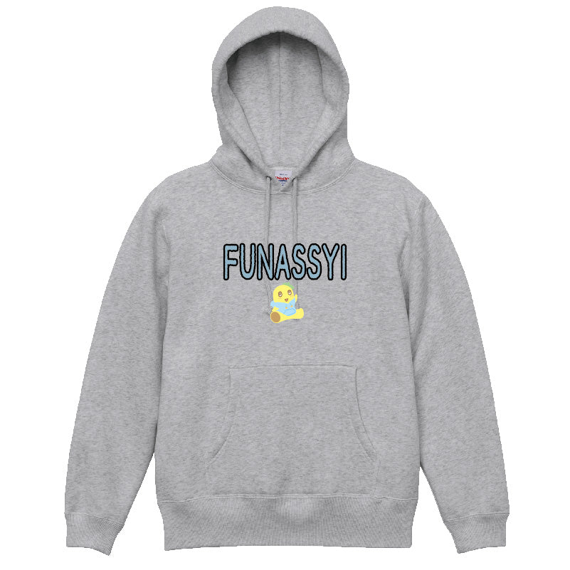 ミックスグレーのパーカーにロゴが大きめなふなっしーのデザイン